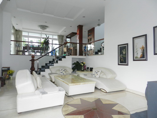 Biệt thự Sông Sài Gòn Thảo Điền Quận 2 được xây dựng đẹp thông thoáng, tầng trệt cao hơn mặt đường chừng 2m cho nên ở phòng khách rất cao thoáng và quan sát được quang cảnh bên ngoài. Biệt thự xây dựng 1 hầm 3 lầu với 5 phòng ngủ rộng rãi, 2 phòng khách, khu bếp mở, hồ bơi mặt tiền sông, sân thượng trên tầng 2 rộng thích hợp làm nơi thư giãn ăn uống ngoài trời.